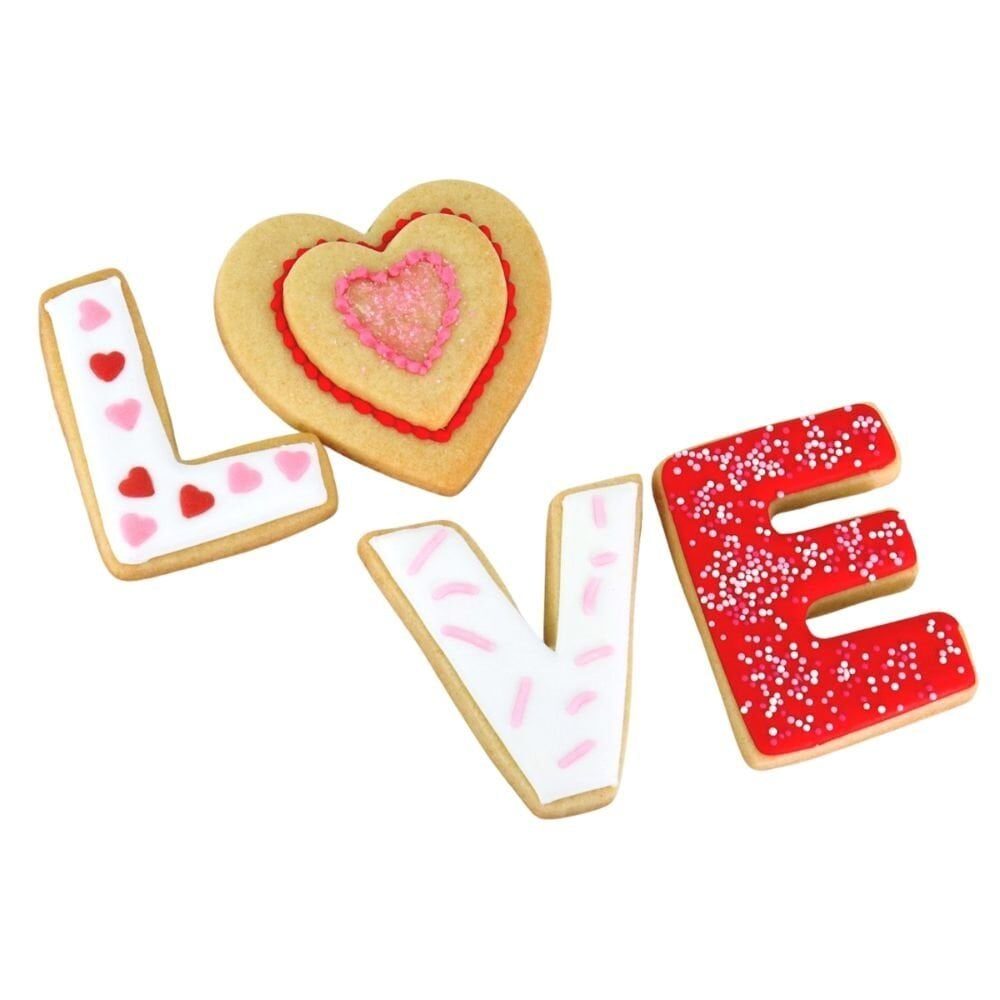 - Set of 5 cookie cutters, featuring letters L, V, E and 2 different sized heart shapes
