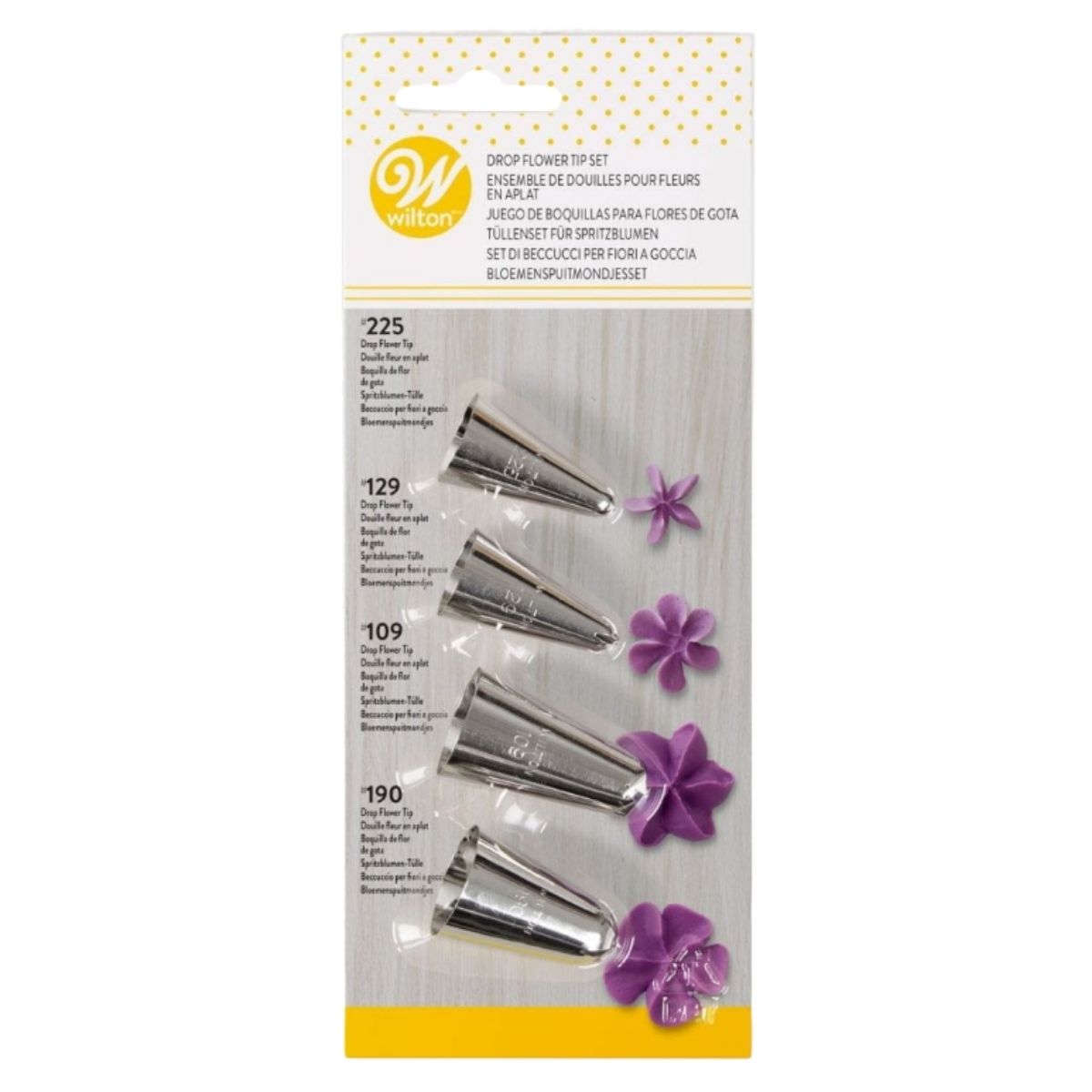The Wilton Drop Flowers Tip Set allows you to decorate cakes or other treats quickly and easily with drop flowers in four sizes. Whether you want to add a simple accent with one small flower on a mini treat or cover a cake with oversized drop flowers for maximum impact, this set can help you decorate amazing cakes.