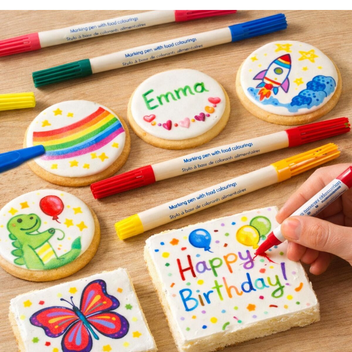 Set of 5 x Edible Ink Pens for Cake Decorating-write directly onto edible surfaces such as icing sheet or wafer paper edible toppers, fondant icing and more! Ideal for adding detail to your cake decorations or an easy cake decorating activity for children!