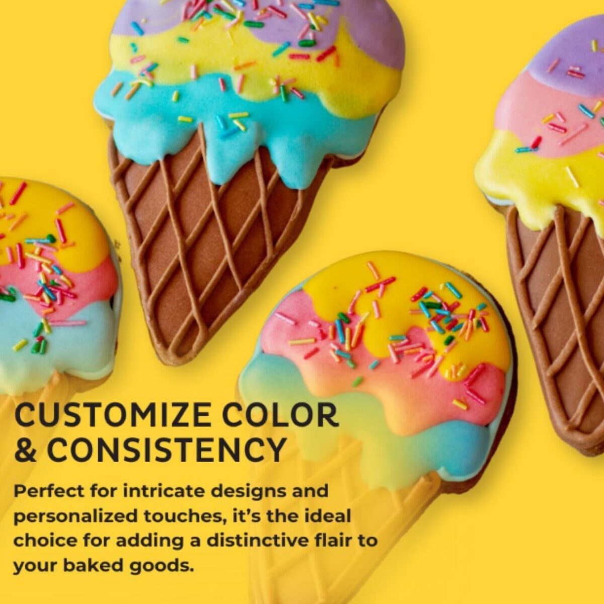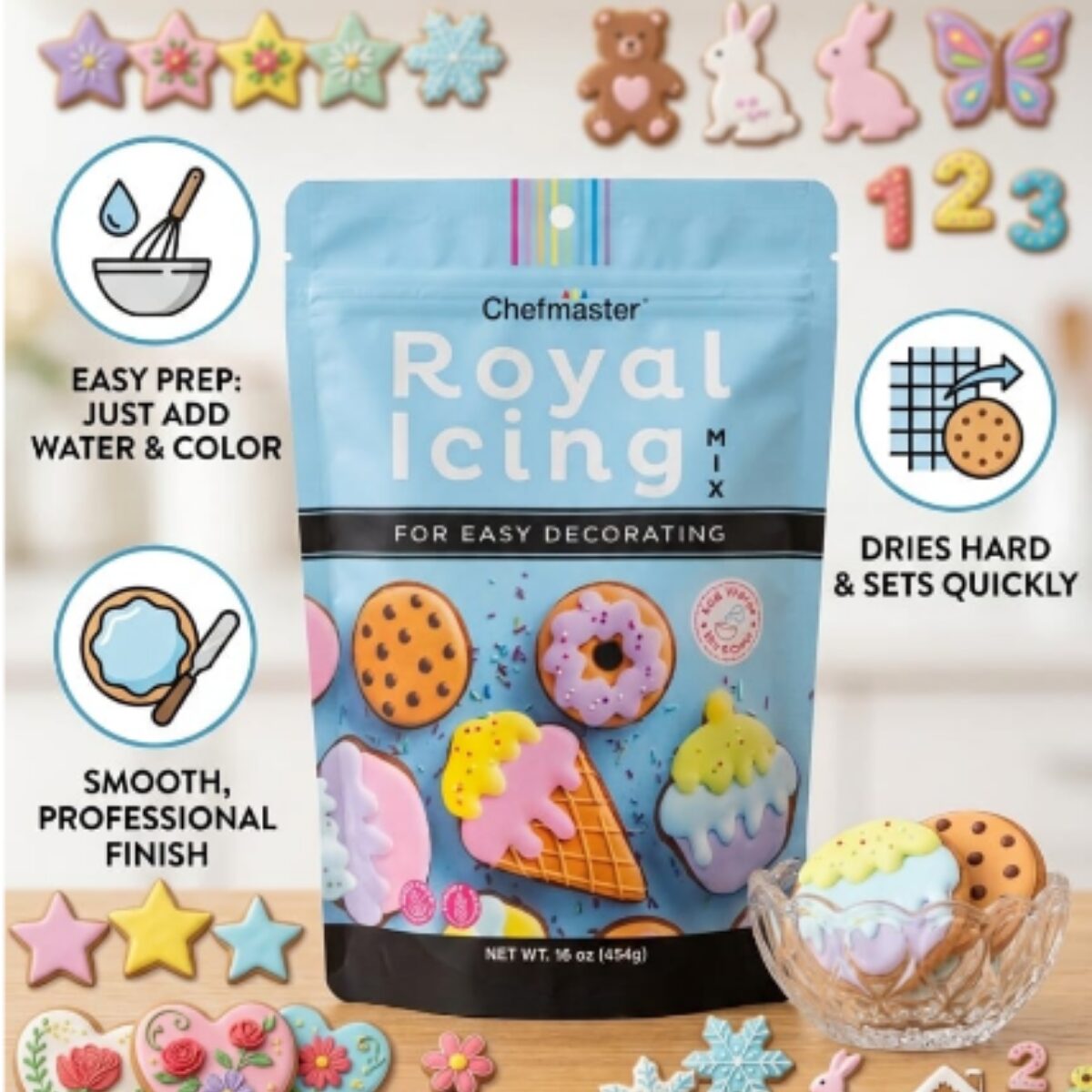 Chefmaster’s white Royal Icing Mix is an extra smooth, versatile solution for decorating cookies and creating cake embellishments. By adjusting the water amount, you can achieve any desired consistency: thicker for creating flowers, leaves, and gingerbread house assembly, or thinner for piping borders, outlines, ornate details, and lettering. It also smoothly coats sugar cookies as flood icing. Customize your creations with Liqua-Gel and gel food colors, allowing deep shades to develop overnight. Easy to use, just add water, and you’re ready to decorate!